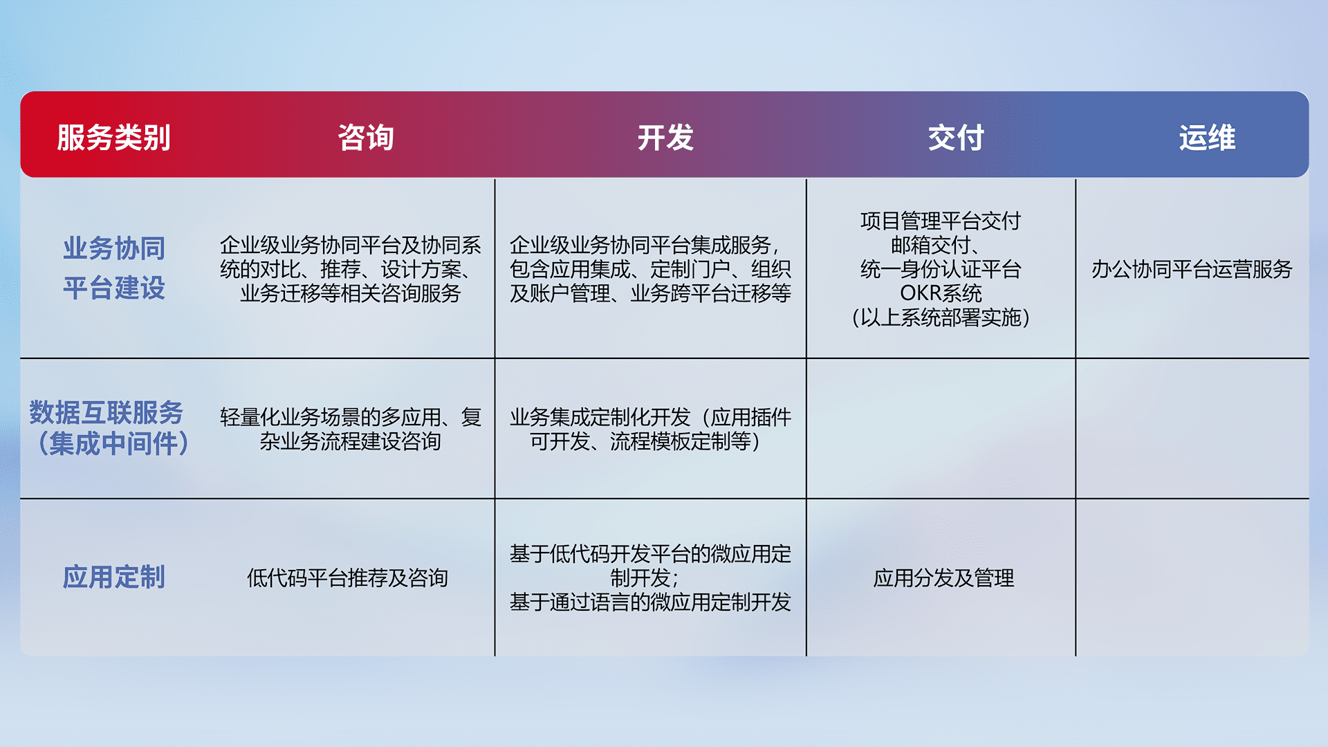 针对钉钉、、、企微、、IDaas等平台级产品提供产品的规划、、、、方案、、、、交付、、、定制化开发等服务,,,实现如统一协同办公、、、、智能客户服务、、、混合会议管理、、、、智能数据查询、、、等业务场景,,,,实现数字化转型。。。。