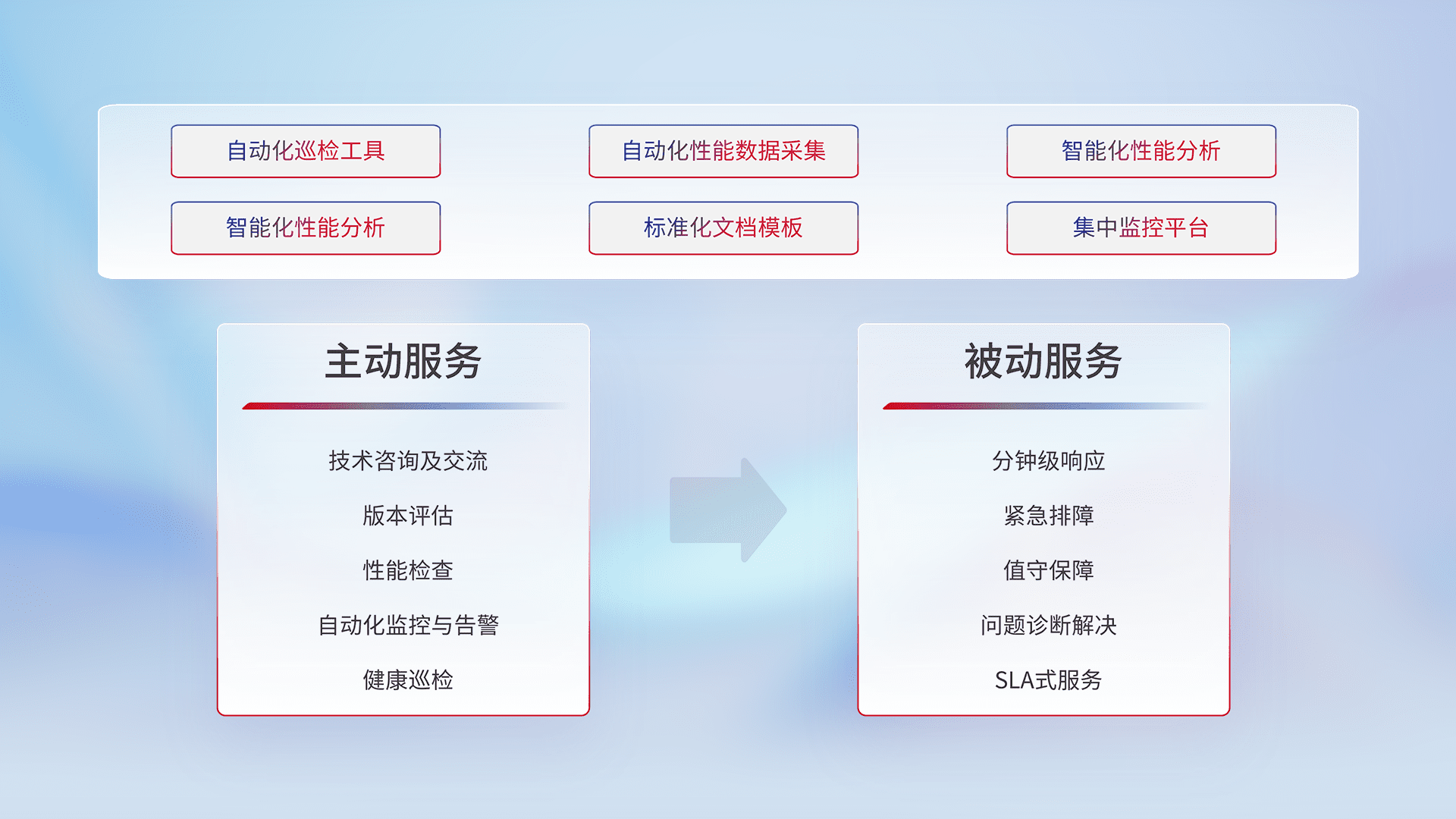 智能化工具和标准化文档,,保障服务质量,,,,提供主动服务(包含技术咨询、、、、版本评估、、、性能检查、、、、自动化监控与告警、、、健康巡检)和被动服务包含(分钟级响应、、、紧急排障、、、值守保障、、、、问题诊断解决、、、、SLA服务)。。。。